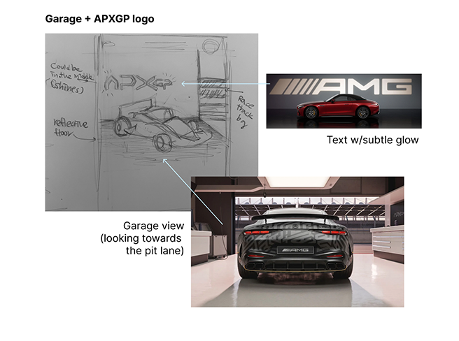 I directed the design team to focus on the garage view facing the race pit lane, conveying clean, high-tech, futuristic visual language.
